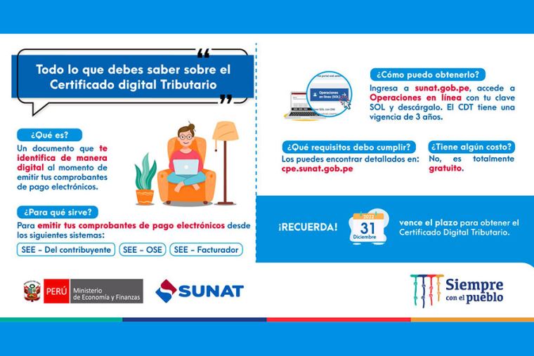 A la fecha más de 79 000 micro y pequeñas empresas han obtenido gratis el certificado digital tributario para implementar sus sistemas de facturación electrónica. El plazo para acceder a este beneficio es hasta el 31 de diciembre del presente año.